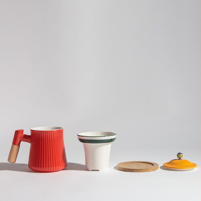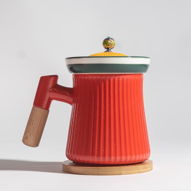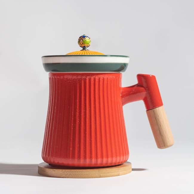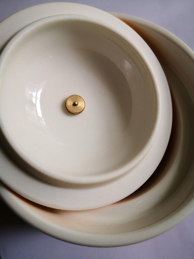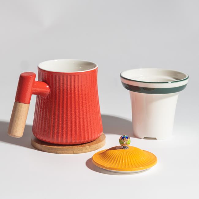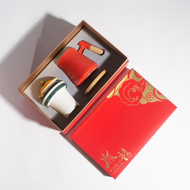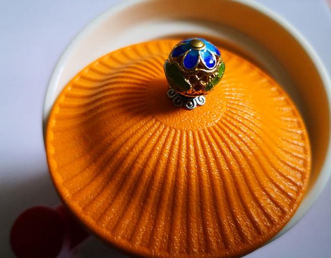 宮廷文化設(shè)計(jì)主題,整體造型模擬宮廷官帽,選用中國(guó)宮廷喜用色彩。在瓷器釉色上進(jìn)行多色撞色工藝,單體雙色釉,整體三色加描金工藝。上釉工藝難度高,釉水結(jié)合難度高。多次上釉,精細(xì)擦洗才得以完成完美的釉色撞色工藝。