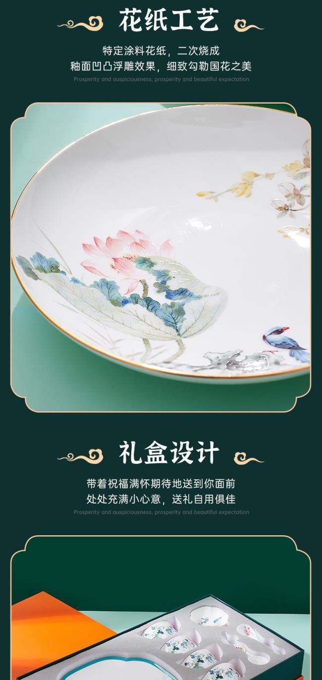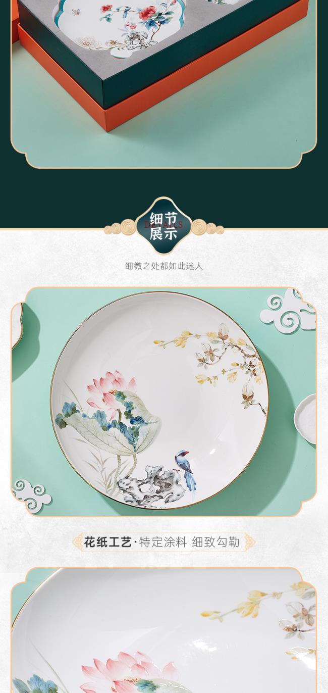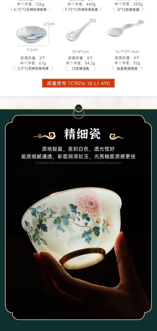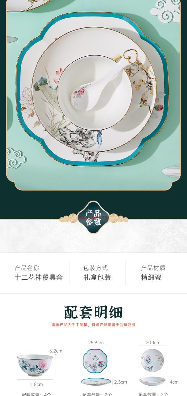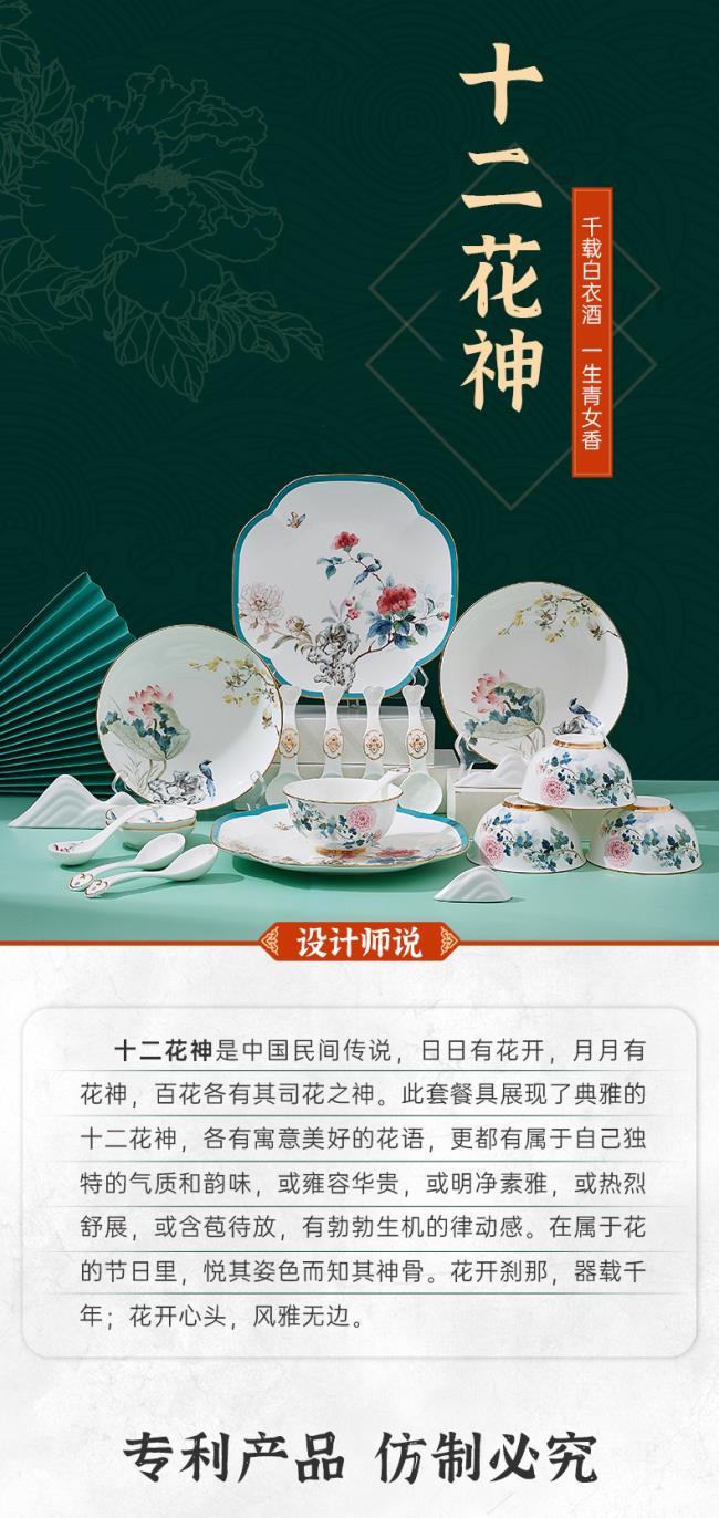 材質(zhì):骨質(zhì)瓷工藝:浮雕花紙 手工描金專利:專利產(chǎn)品包裝:高檔禮盒,腰封,手提袋配置:9.75寸墊盤2,8寸飯盤2,4.75寸飯碗4,兩用筷架4,湯匙4,3.5寸味碟2.
