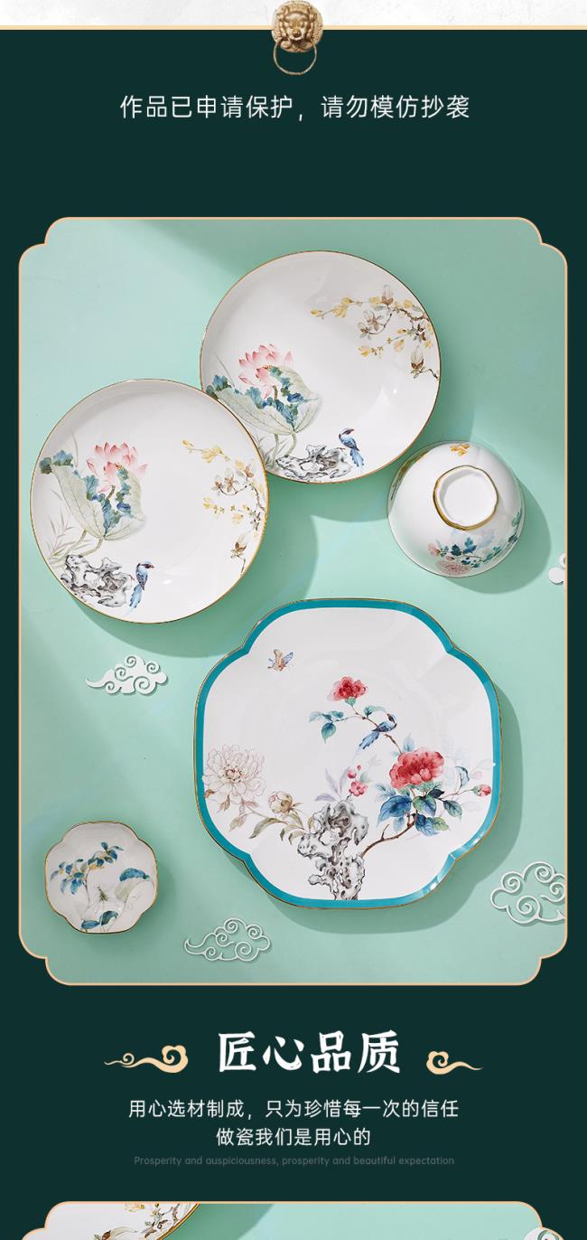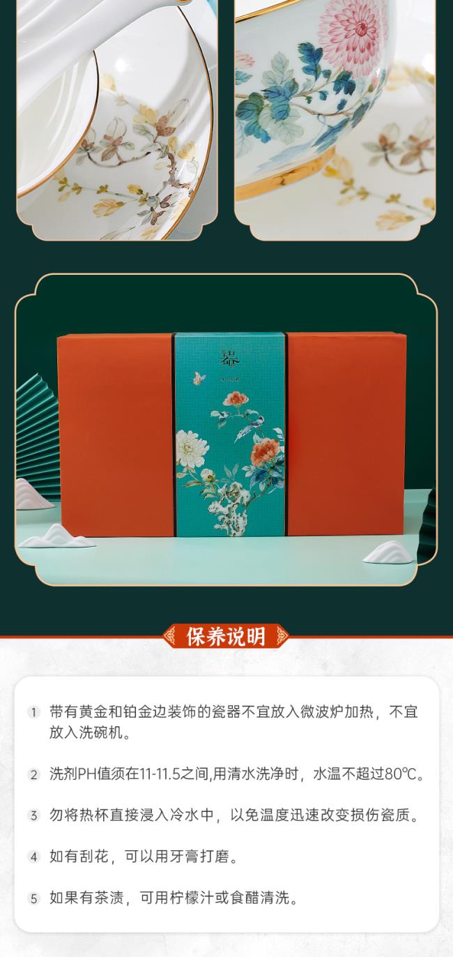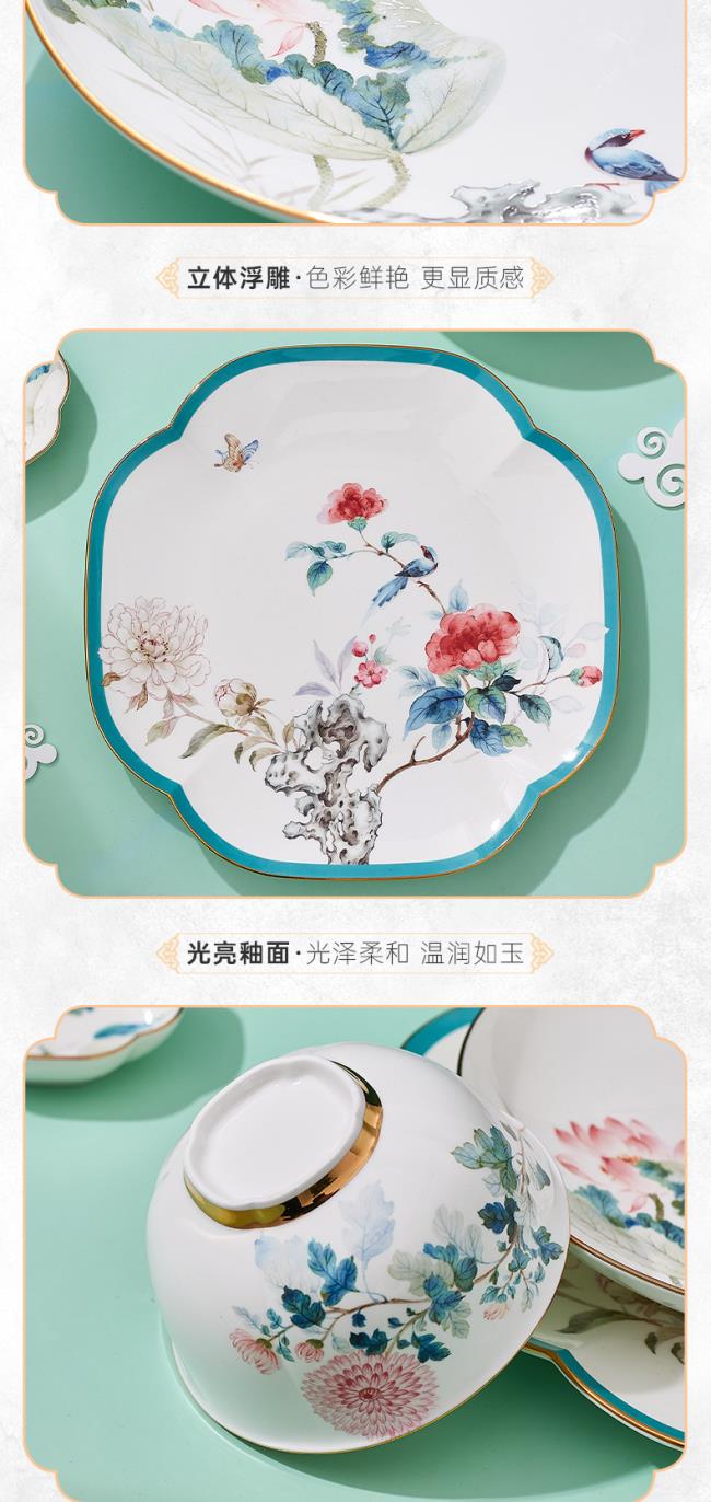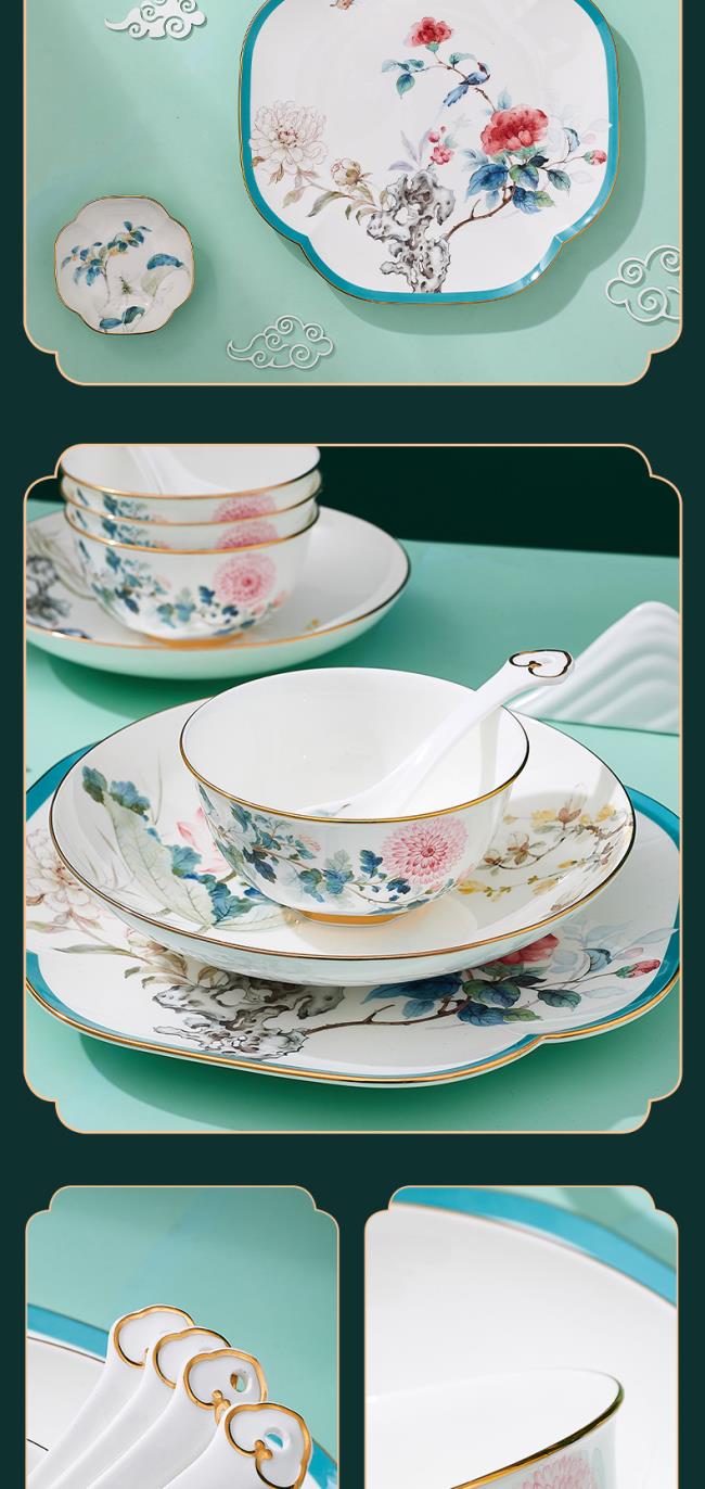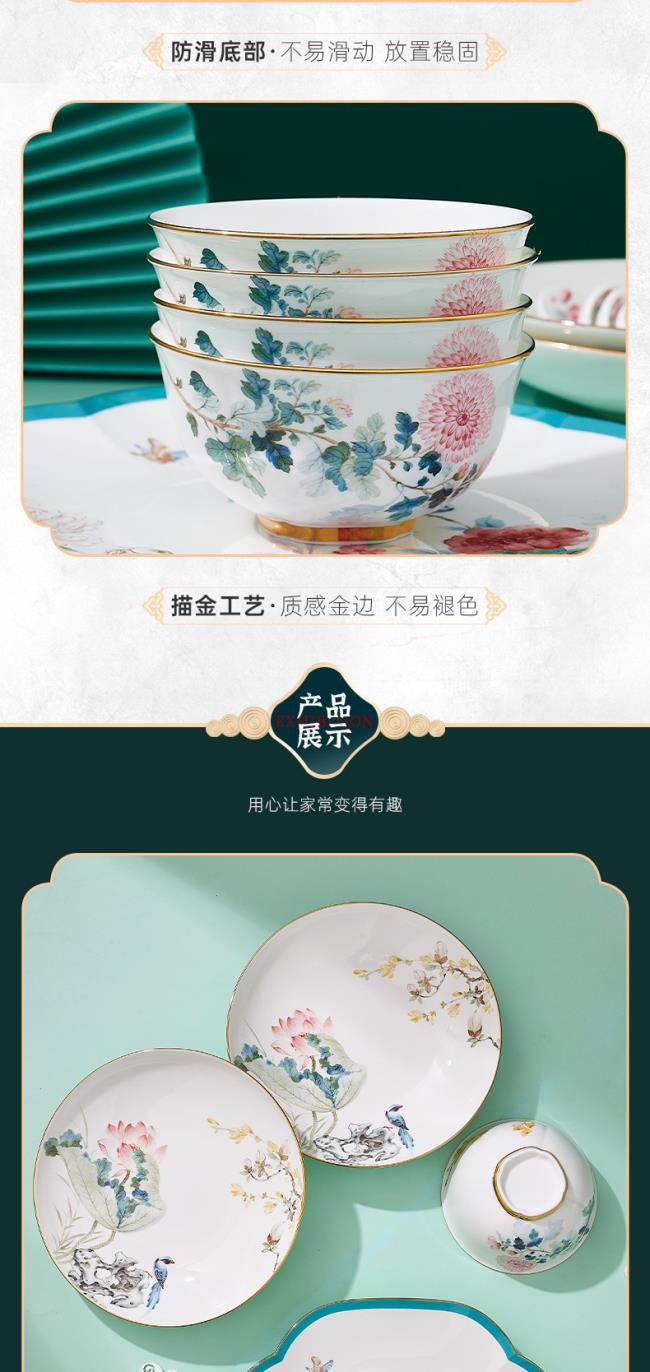 材質(zhì):骨質(zhì)瓷工藝:浮雕花紙 手工描金專利:專利產(chǎn)品包裝:高檔禮盒,腰封,手提袋配置:9.75寸墊盤2,8寸飯盤2,4.75寸飯碗4,兩用筷架4,湯匙4,3.5寸味碟2.