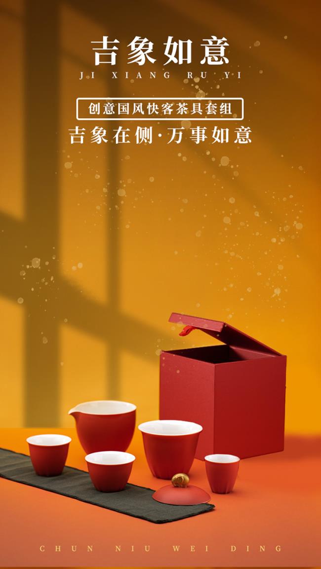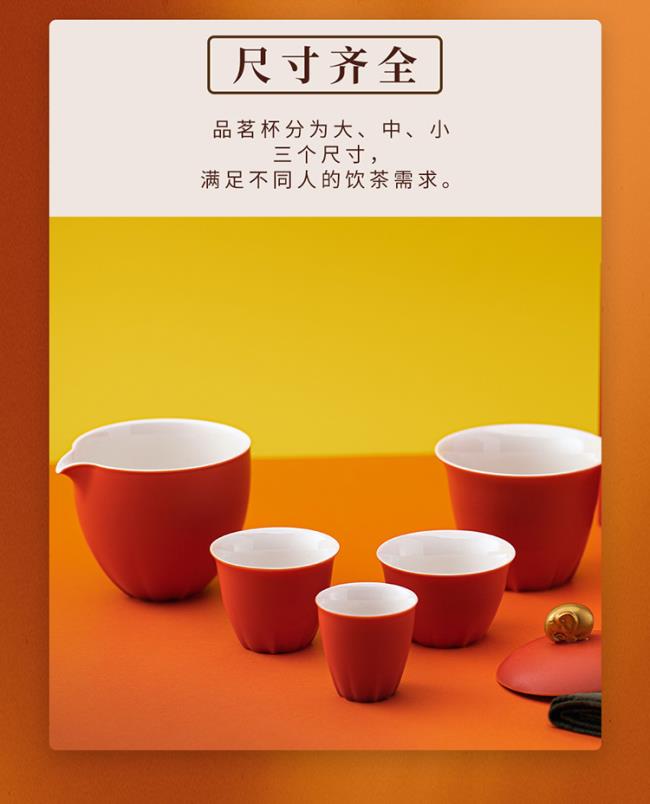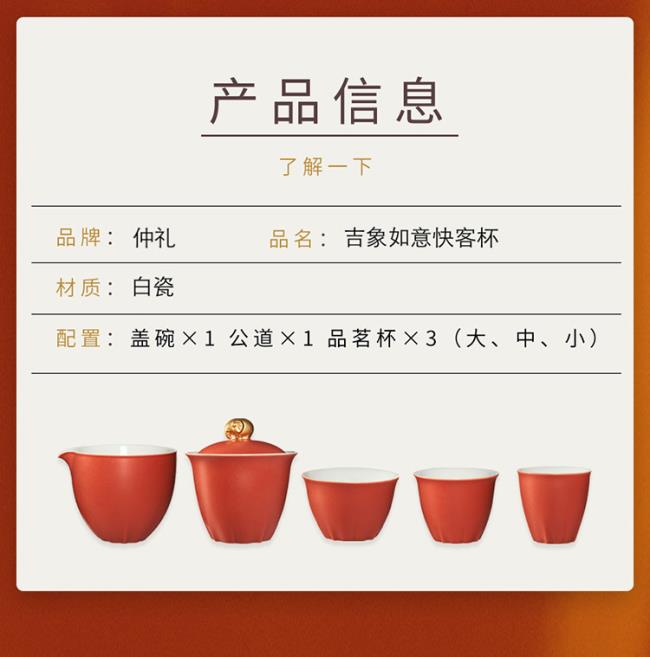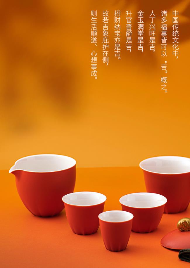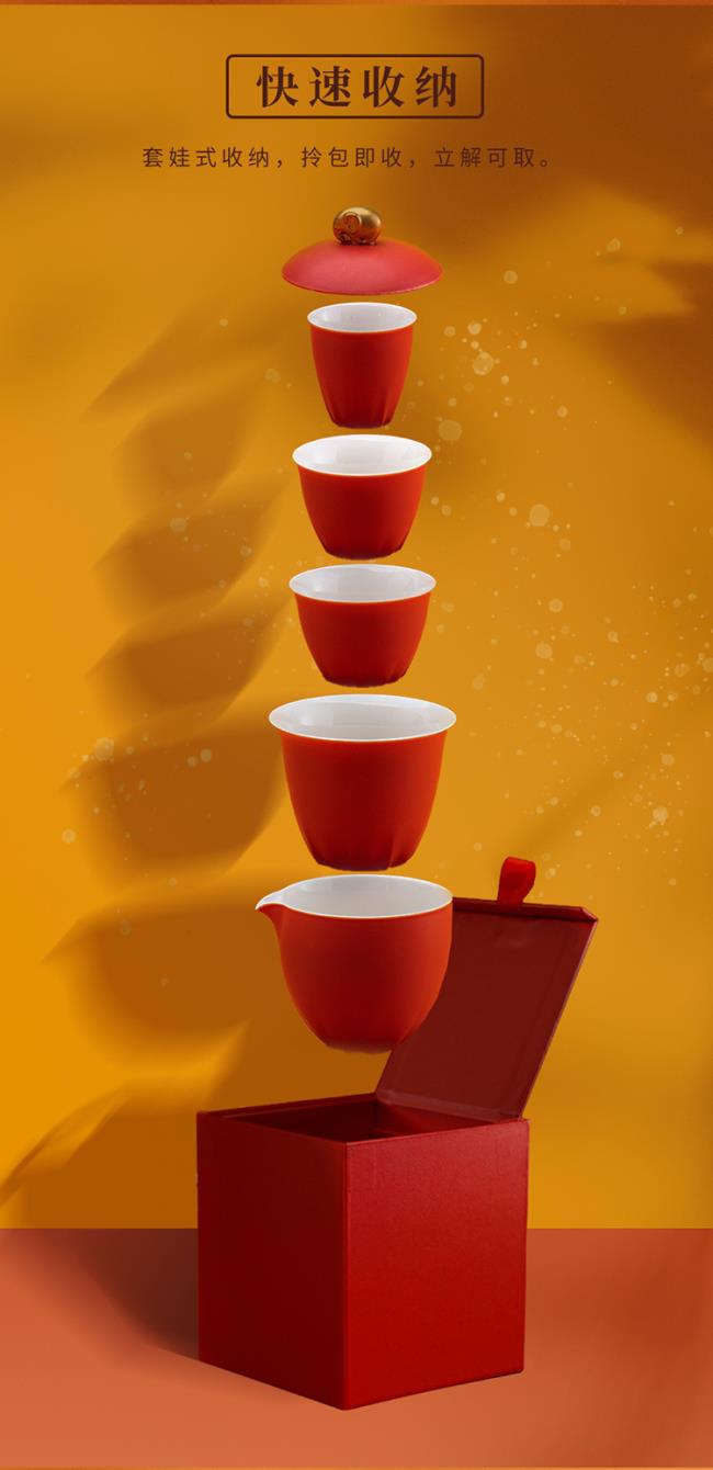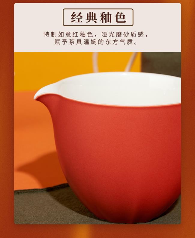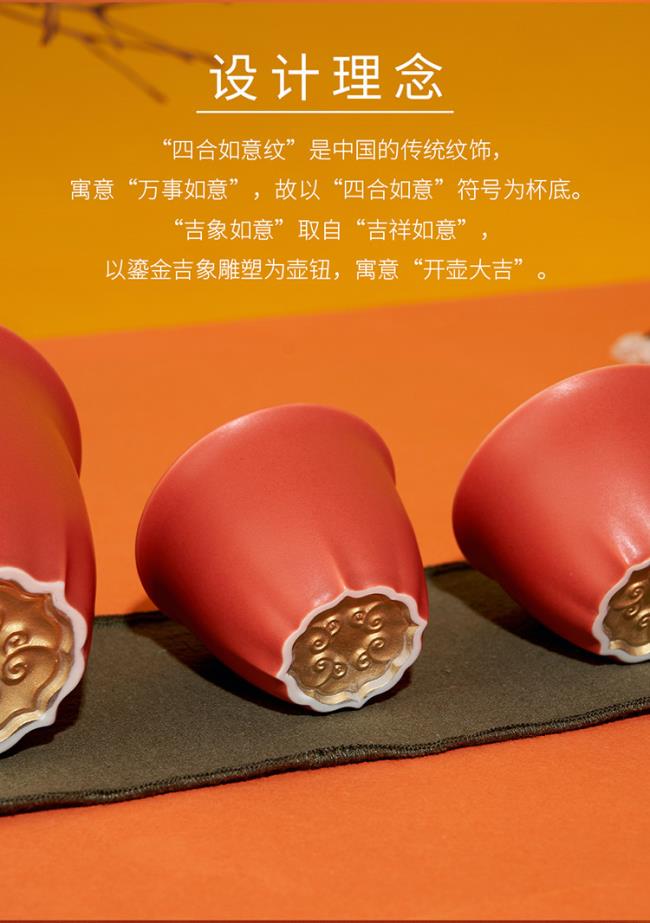 采用特制“如意紅”釉色,紅釉是眾釉色中最難燒制的釉色之一,有“千窯一寶”之稱。整套產(chǎn)品采用套娃式收納設(shè)計,精致玲瓏,特別適合差旅便攜。吉象蓋頂,吉祥寓意。如意杯底,萬事如意,套娃機構(gòu),便攜收納。