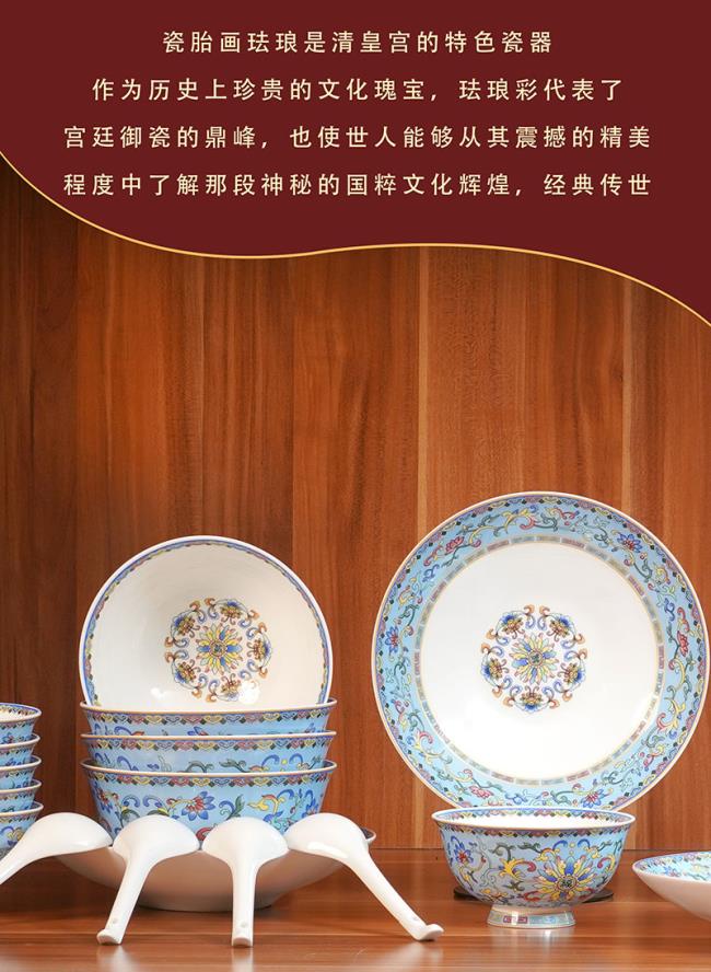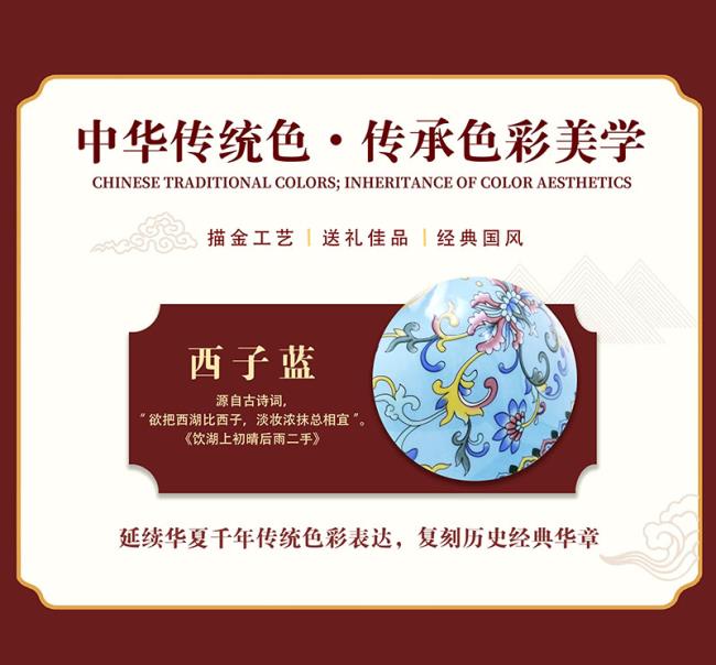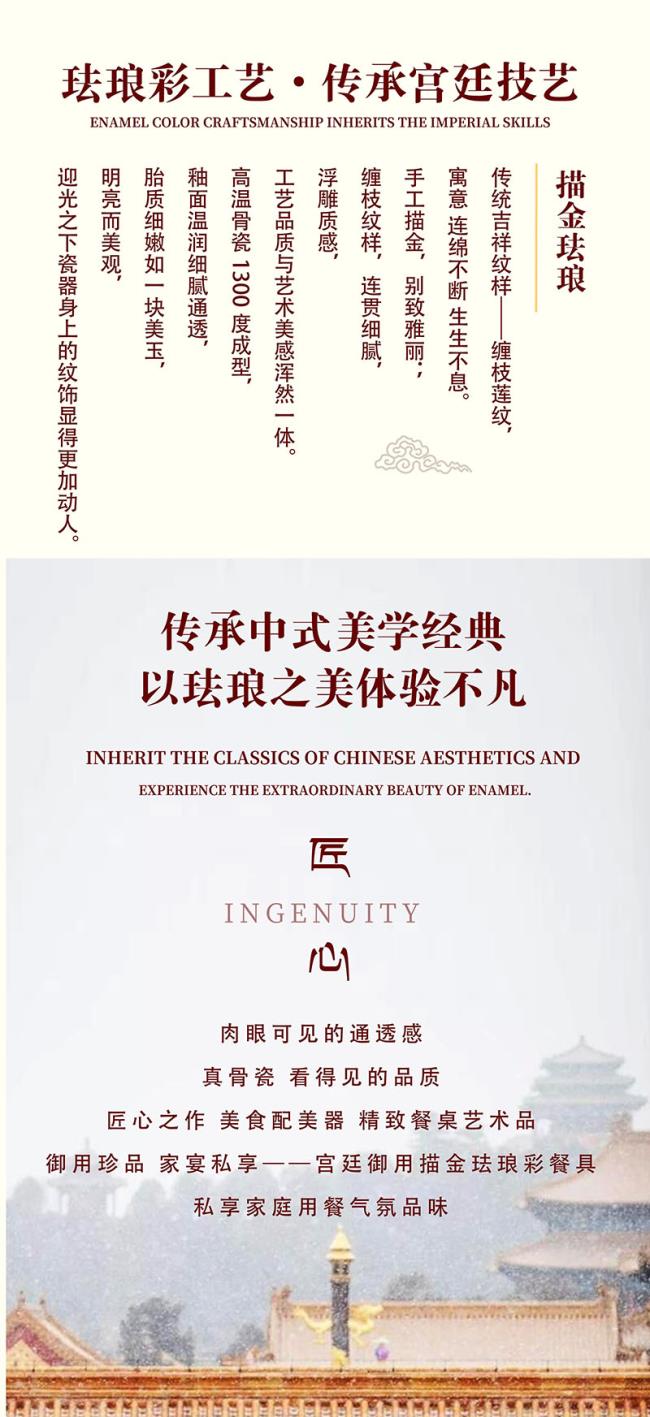 傳承中式美學(xué)經(jīng)典,以琺瑯之美體驗不凡。瓷胎畫琺瑯是清皇宮的特色瓷器,作為歷史上珍貴的文化瑰寶,琺瑯彩代表了宮廷御瓷的鼎峰,也使世人能夠從其震撼的精美程度中了解那段神秘的國粹文化輝煌,經(jīng)典傳世。中華傳統(tǒng)色,傳承色彩美學(xué),延續(xù)華夏千年傳統(tǒng)色彩表達,復(fù)刻歷史經(jīng)典華章?,m瑯彩工藝,傳承宮廷技藝,描金琺瑯,傳統(tǒng)吉祥紋樣——纏枝蓮紋,寓意 連綿不斷 生生不息。手工描金,別致雅麗;纏枝紋樣,連貫細膩,浮雕質(zhì)感,工藝品質(zhì)與藝術(shù)美感渾然一體。高溫骨瓷1380度成型,釉面溫潤細膩通透,胎質(zhì)細嫩如一塊美玉,明亮而美觀,迎光之下瓷器身上的紋飾顯得更加動人。匠心之作,美食配美器,精致餐桌藝術(shù)品,御用珍品,家宴私享。