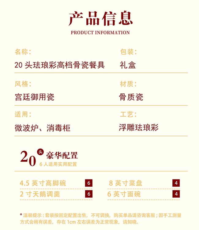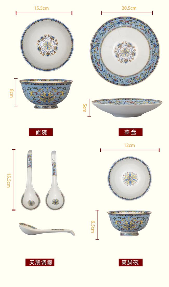 配置:6x 4.5寸高腳碗,6x 2寸天鵝調(diào)羹,4x 8寸菜盤,4x 6寸面碗.